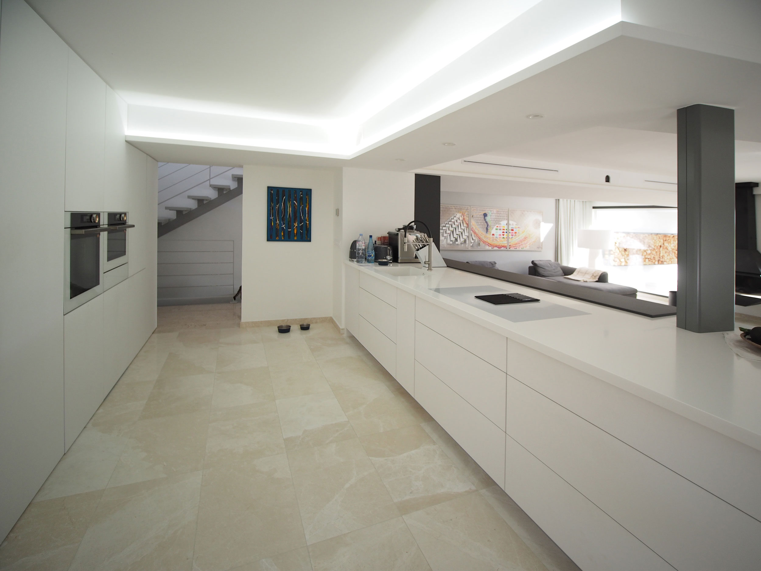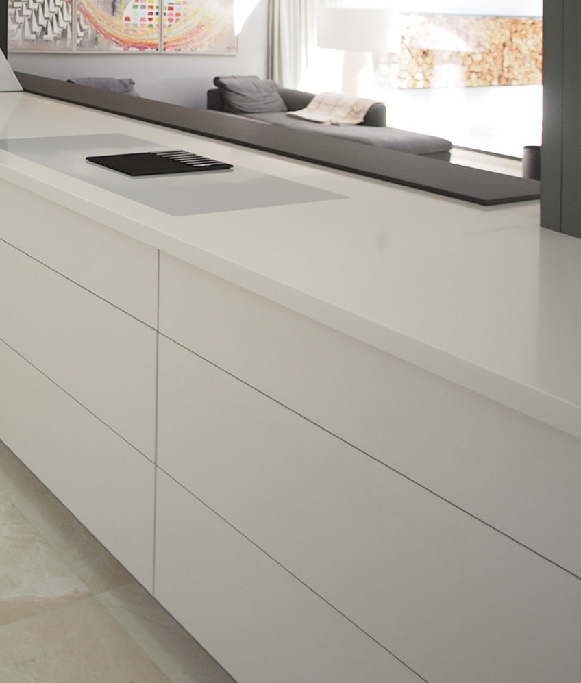 Dans cet appartement un aménagement chic et sobre tire pleinement profit du petit espace de la cuisine. Les camaïeux monochrome des différents éléments enveloppent les murs sans altérer la clarté provenant du puits de jour.